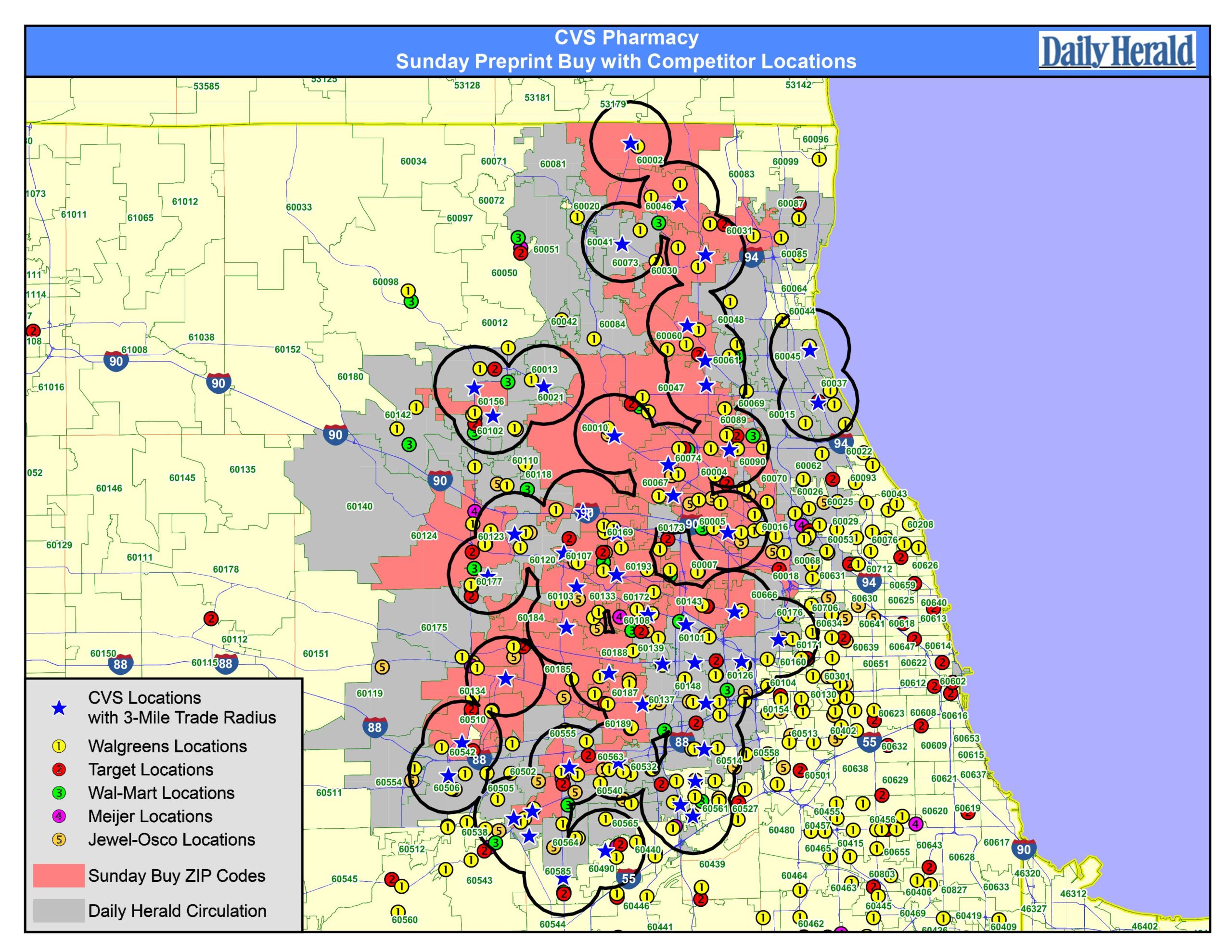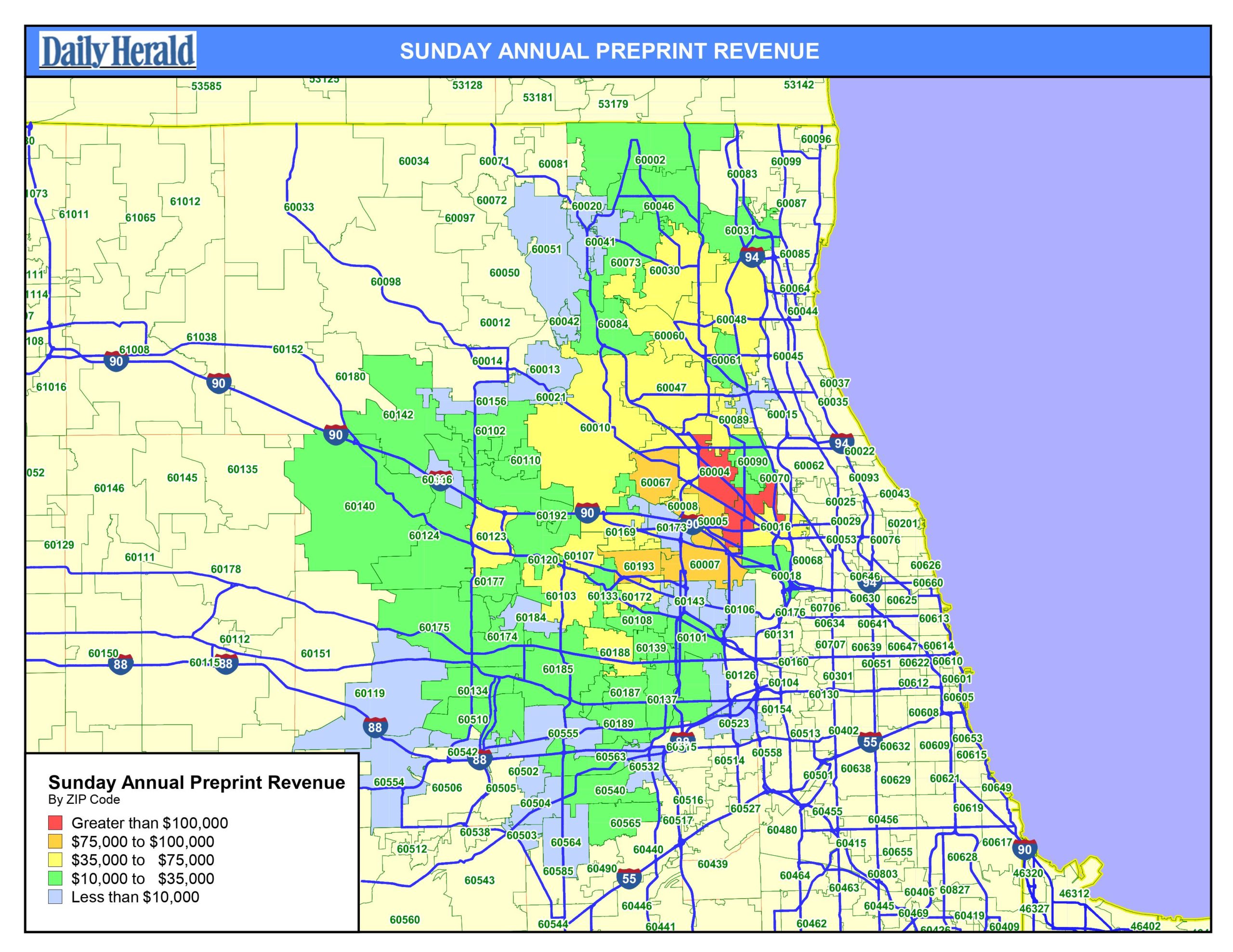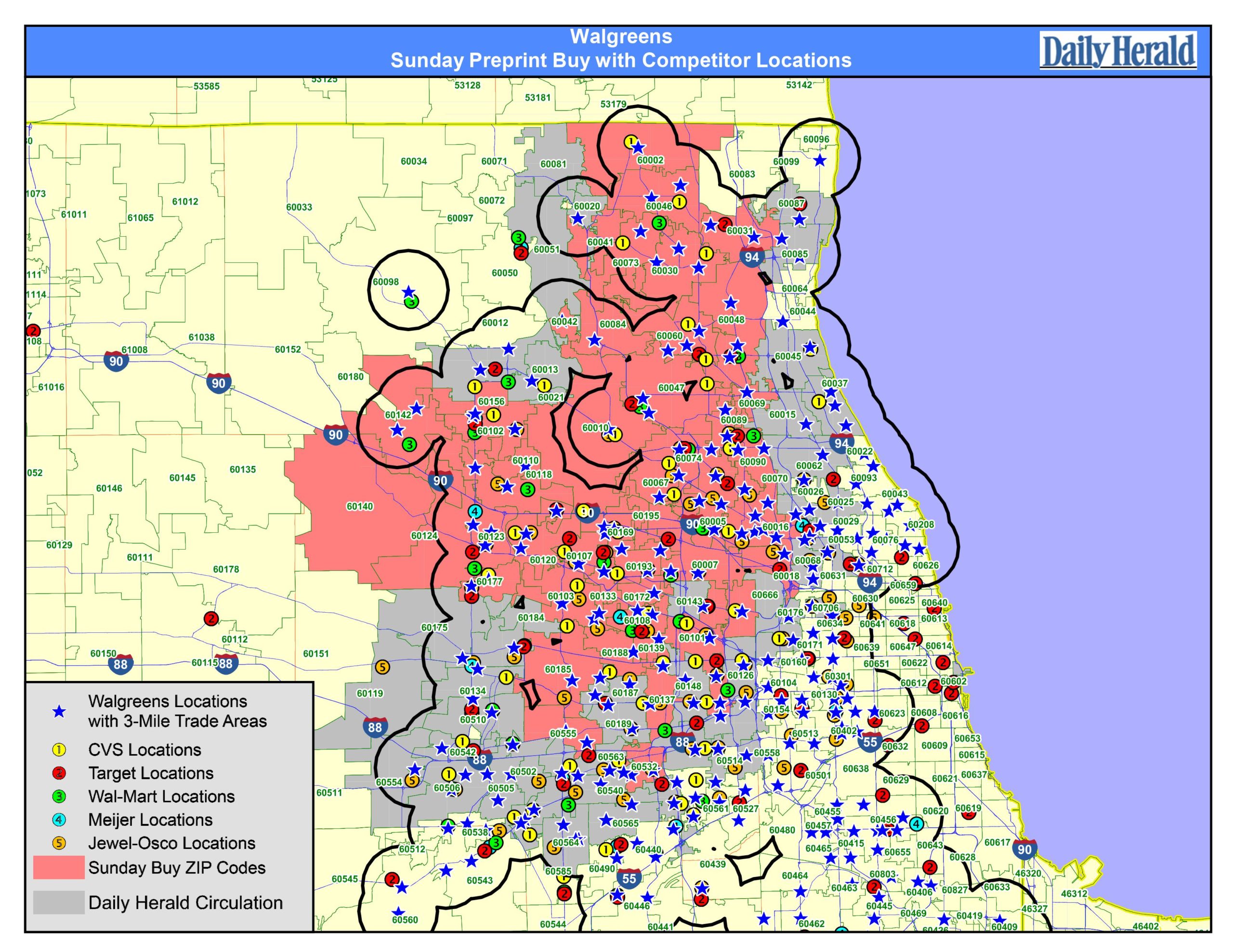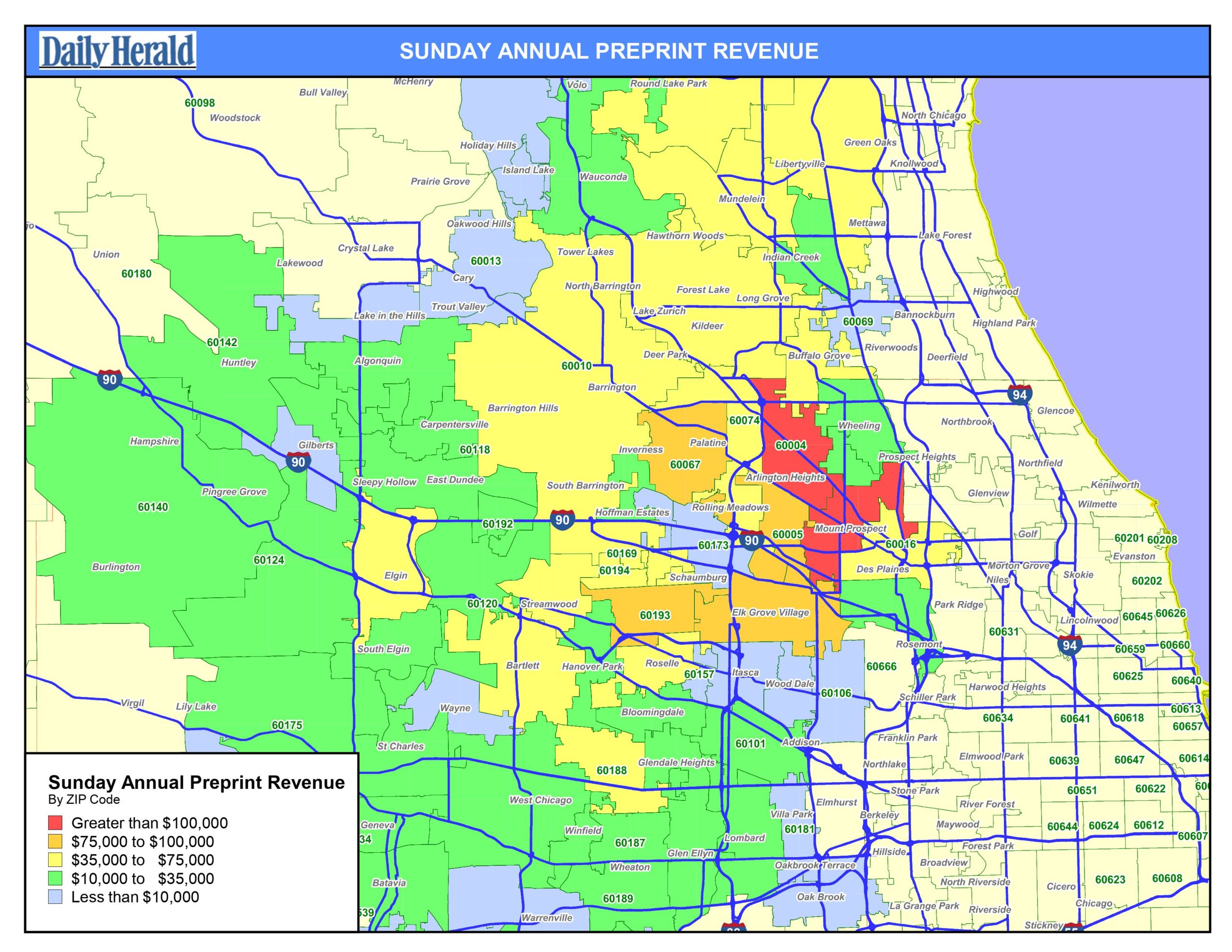 New Perspective furnished custom maps and reports for many advertisers and prospective advertisers. These maps display advertiser locations overlaid on Daily Herald coverage with current buy ZIP Codes highlighted. These maps are perfect for sales presentations as they provide an easy-to-understand visual of covered locations as well as opportunities to offer coverage for additional locations in the market.