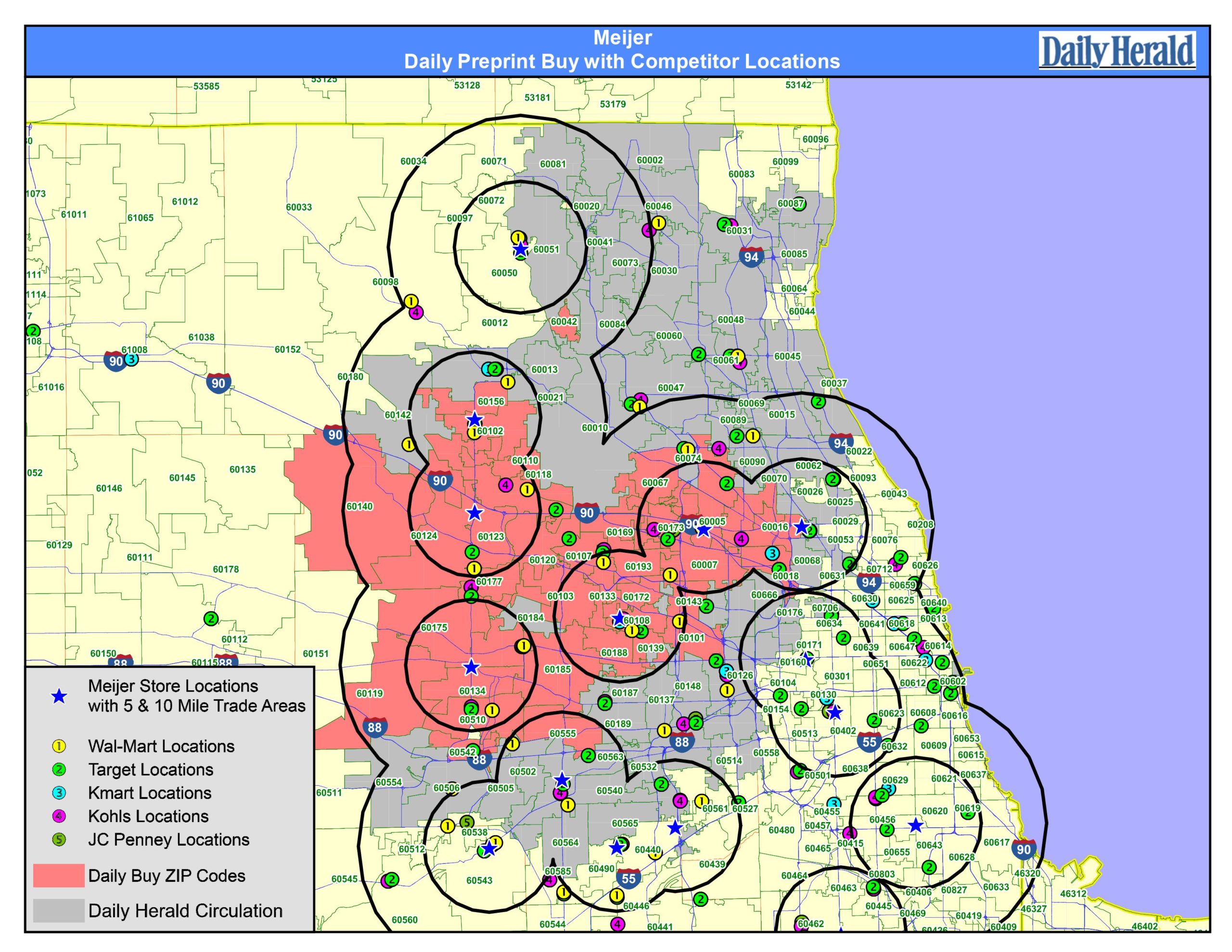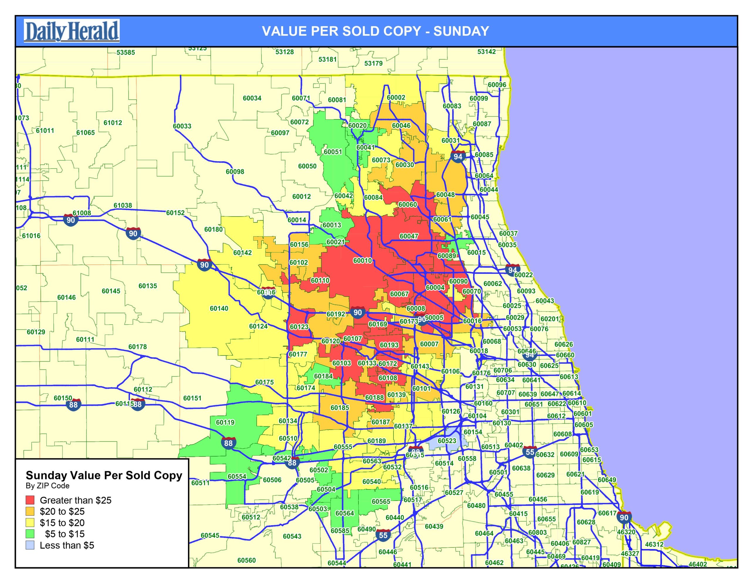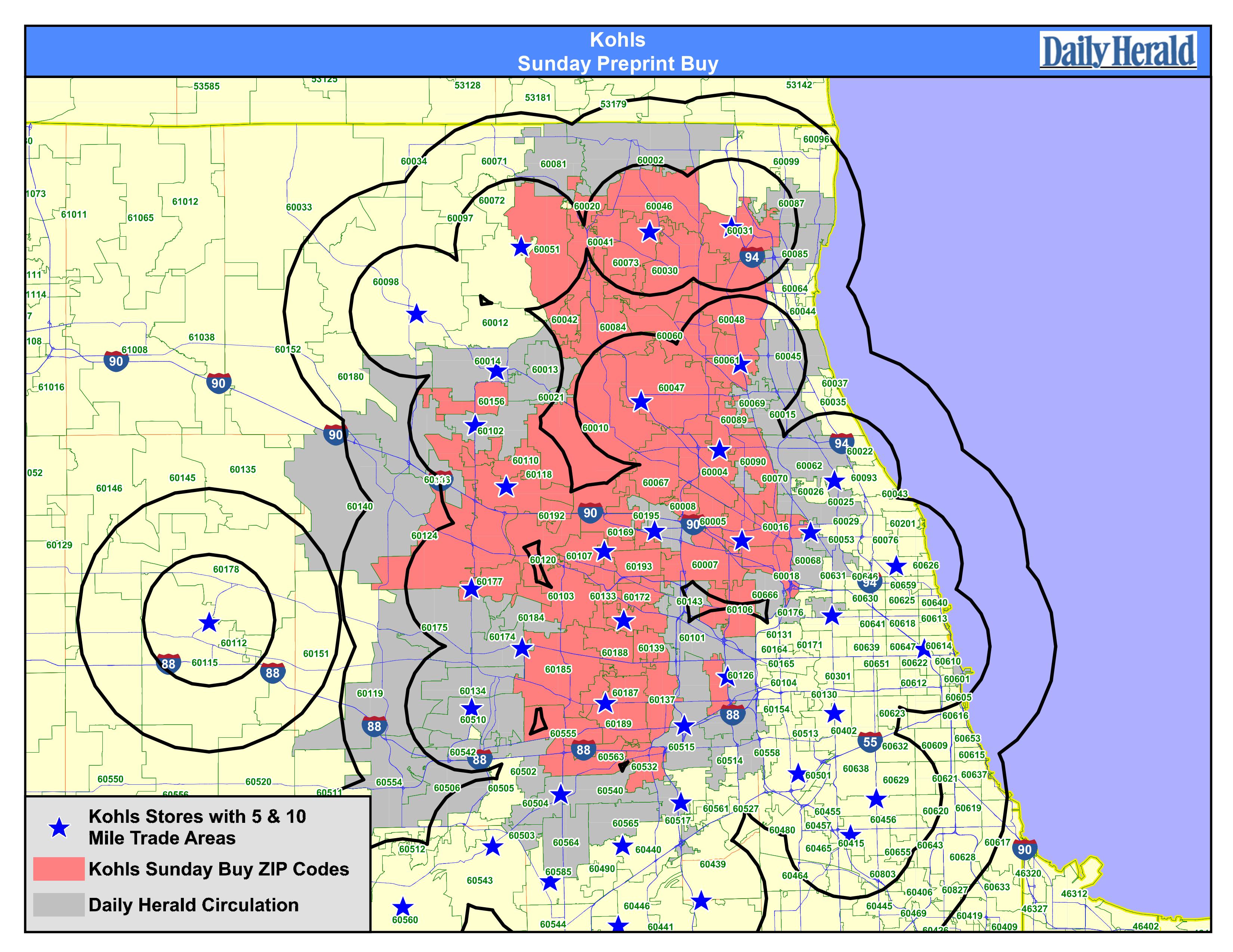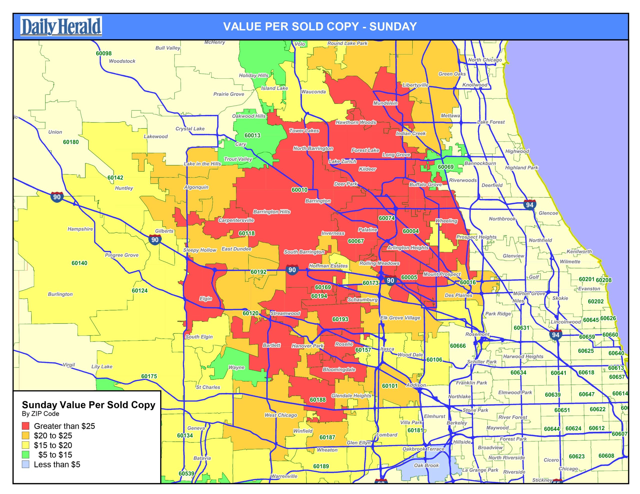 New Perspective furnished custom maps and reports for many advertisers and prospective advertisers. These maps display advertiser locations overlaid on Daily Herald coverage with current buy ZIP Codes highlighted. These maps are perfect for sales presentations as they provide an easy-to-understand visual of covered locations as well as opportunities to offer coverage for additional locations in the market.
