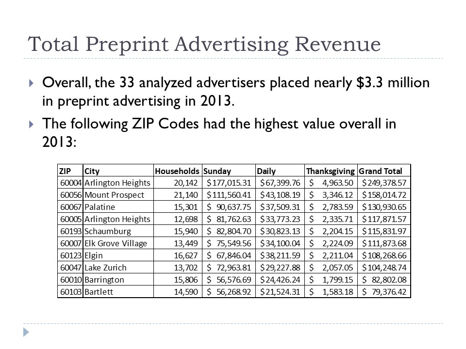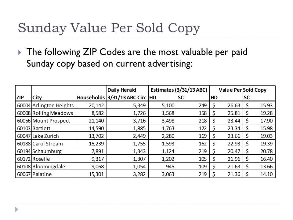 These materials were created as part of a larger analysis completed by New Perspective and NGM Partners. The Daily Herald provided New Perspective with a full roster of preprint advertiser buys by ZIP Code. The data included the run day, advertising vehicle, and average CPM. Utilizing the latest audited circulation, ZIP Codes were prioritized according to the value that each Daily & Sunday sold copy represented in advertising revenue. Home Delivery and Single Copy for each daypart were also analyzed. This analysis provided a roadmap for circulation growth and retention efforts, ensuring that the most valuable ZIP Codes were identified.